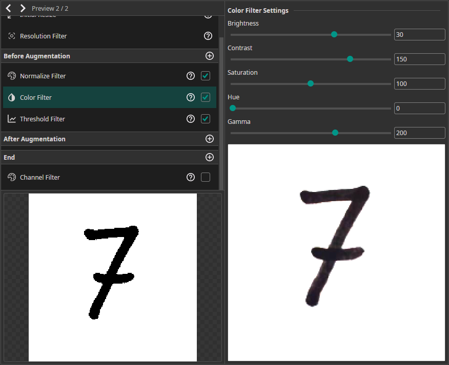 If you find structural differences, you have a few different options to improve your model's performance. The easiest approach would be to use filters and data augmentations to replicate the conditions of your deployment environment. For example, if you notice that differences in the lighting conditions cause issues, you can try to recreate them with a Color Filter in the Prefilters tab or a Color Augmentation in the Augmentations tab. Alternatively, you can apply filters to your deployment images before feeding them into the model, but since adding additional filters to an existing model isn't supported by OneWare Studio at the moment, you would need to implement your own solution.