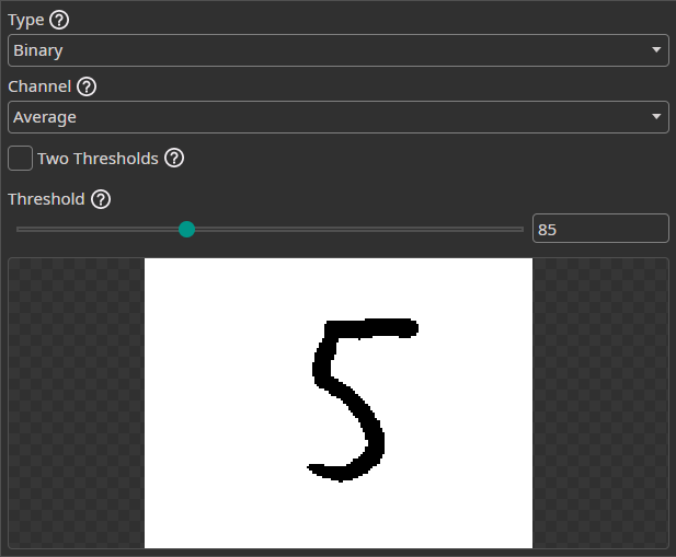 Binary: Pixels below the threshold are set to black and pixels above the threshold to white.To Zero: Pixels below the threshold are set to black.To One: Pixels below the threshold are set to white.To Zero Inverted: Pixels above the threshold are set to black.To One Inverted: Pixels above the threshold are set to white.